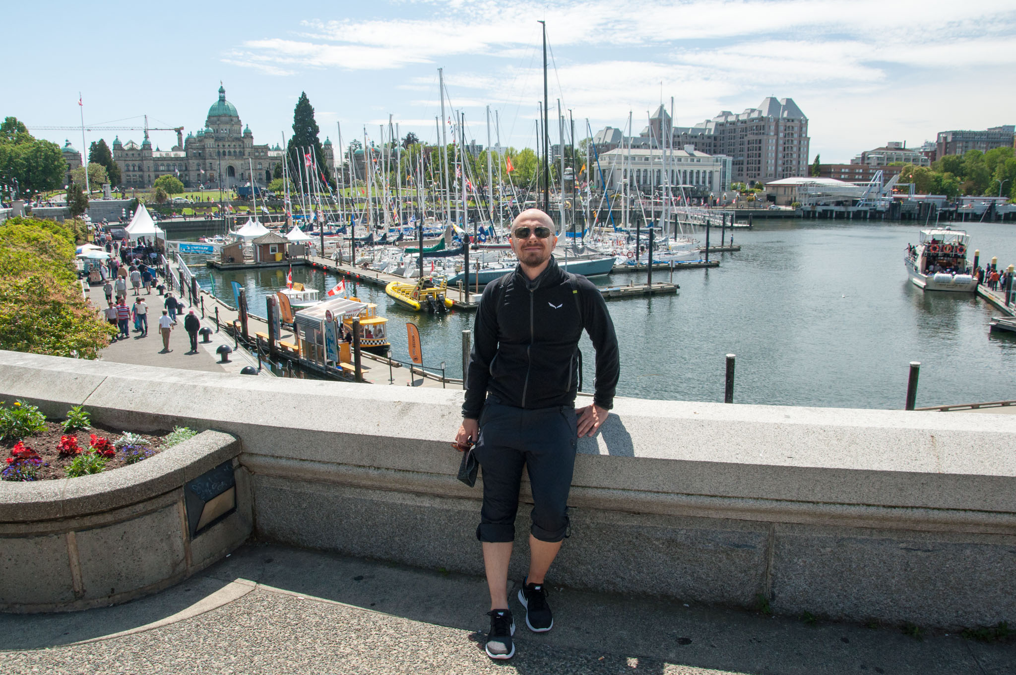 Nun aber zur Touri-Info um richtig was von Victoria zu sehen. Und diese Begegnung möchte ich als besonders positiv herausstellen: Wir nähern uns der Visitor Information im Hafen, gehen noch auf der Straße, da ruft uns jemand aus der Visitor Information zu, wie es geht und ob er uns helfen kann. Und natürlich kann Ryan uns helfen, der sich aus einem Fenster wie ein Straßenverkauf heraus lehnt. Wir fragen nach Aktivitäten in Victoria, besonders nach Fahrradtouren. Und schon malt er uns die wohl schönste Tour auf, die die Gegend zu bieten hat und auch, wo wir Räder ausleihen können. Samir bekommt außerdem einen Tipp, wo man Nanaimo Bars essen kann, wo wir auf der Rundtour einkaufen können für ein Dinner und wie wir am schnellsten wieder zurückfahren. Das alles erzählt er mit dem größten Funkeln in den Augen, das ich je gesehen habe. Dieser Mann lebt für seinen Job! Und ja, bis auf die Nanaimo Bar, für dies es am Abend zu spät war, haben wir das auch so umgesetzt.