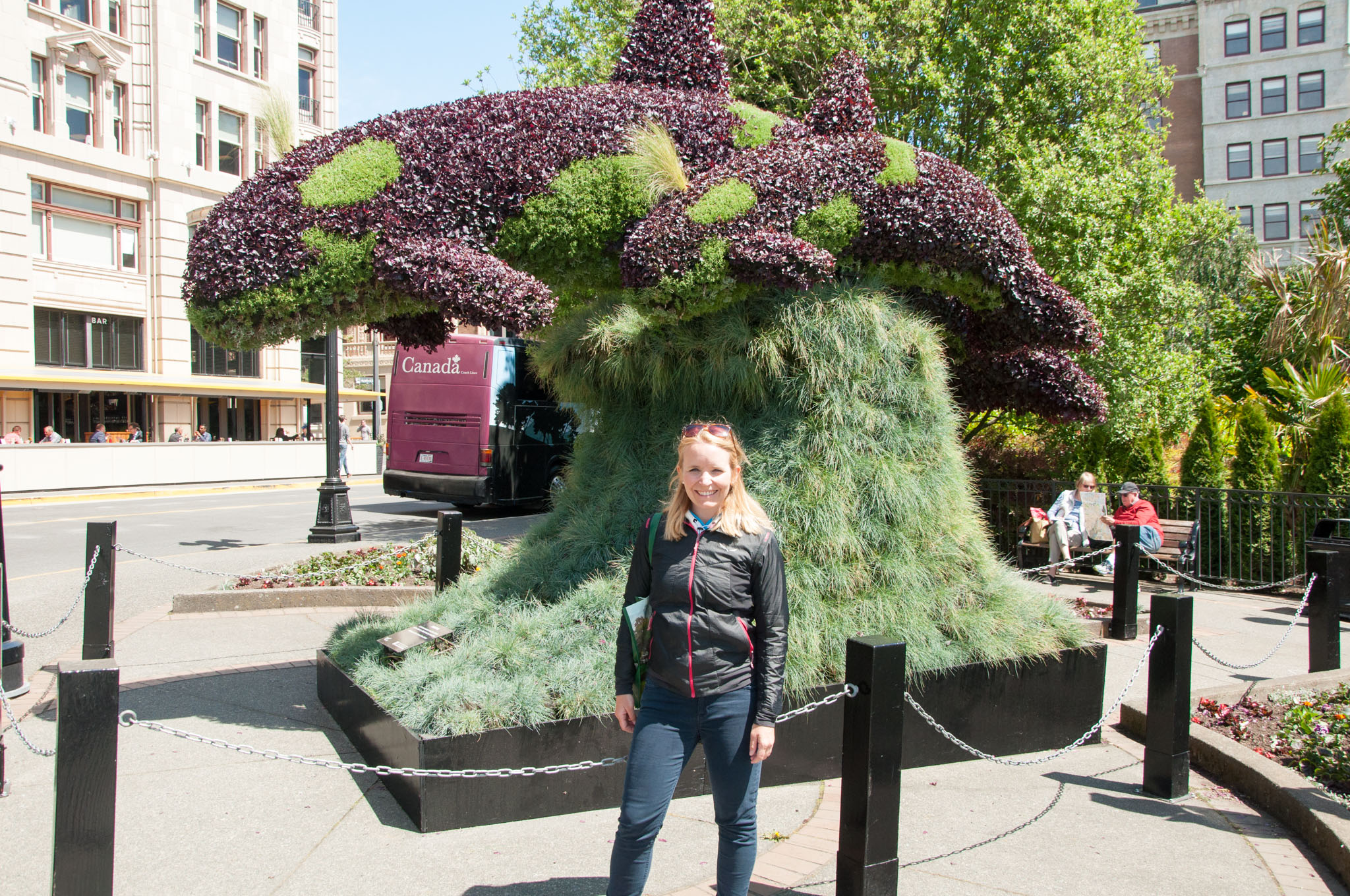 Nachdem wir die Räder abgegeben haben, sehen wir in der Einkaufsstraße von Victoria noch diesen lustigen Gesellen, von dem wohl mehr Bilder gemacht wurden als dass er Geld eingenommen hat. Seine Musik war aber auch leider nicht so toll wie sein Kostüm.