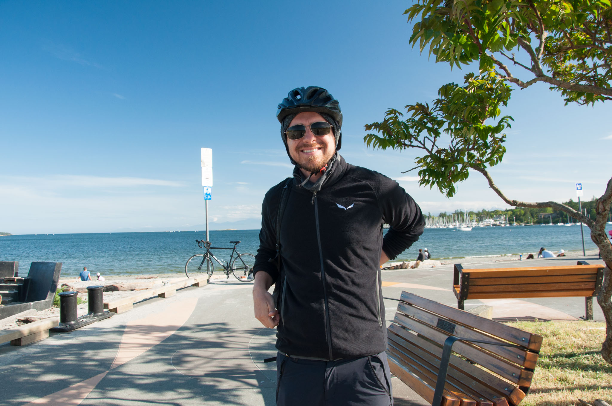 Ab dem Clover Point Park geht es dann aber mit dem Fahrradweg. Wir kommen durch teilweise sehr noble Gegenden durch mit meterhohem Rhododendron und 2 Grundstückszufahrten. In der Oak Bay Marina machen wir schließlich Pause, um etwas zu essen. Wir finden oben ein leeres, nobles Restaurant und eine Ebene darunter einen guten Strandimbiss. Hier geht es auch noch etwas nobler zu als im Jam’s Café und die Portionen sind entsprechend kleiner. Aber gut ist es, ich habe gebackenen Brie und Samir ein überbackenes Thunfischsandwich. Wir fahren noch weiter bis zur Cadboro Bay, bevor wir davon ablassen, heute noch den Mount Doug zu machen. Zum einen müssen wir die Räder zurückbringen, zum anderen sind wir auch schon 20km einfach unterwegs.