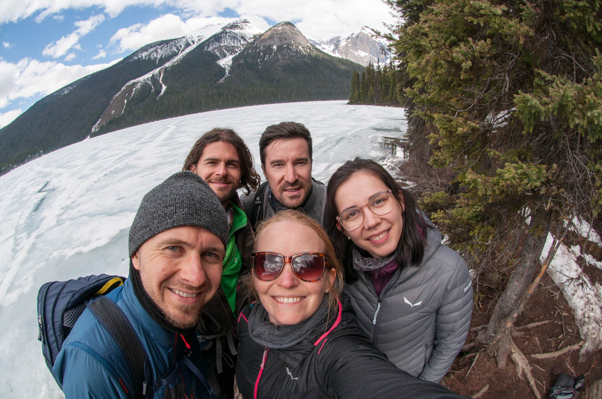 Während Astrid, Samir und ich nach deem Frühstück nochmal (erfolglos) die Zimmerrate für die 2. Nacht im Hotel nachverhandeln, machen sich Andrei und Chris bei der Parkverwaltung über mögliche Aktivitäten schlau. Moraine Lake ist wegen Lawinengefahr definitiv nicht möglich – die Straße dorthin berechtigt gesperrt. Emerald Lake ist eine Option, Wapta Falls auf jeden Fall sehenswert. Zum Lake OHara führt keine Straße, man müsste 11km hinwandern, teilweise sind Schneeschuhe nötig. Diese Option ist sehr schnell gestorben. Wir machen uns also auf zum Yoho Nationalpark, Emerald Lake. Leider ist auch dieser See noch zugefroren und man kann nicht das schöne türkisfarbene Wasser bewundern. Es geht eher ins weiß-blau-graue. Am See ist ein Konferenzzentrum mit Außenwhirlpool, wo einige Kanadier oben ohne mit maximal den Füßen im warmen Wasser sitzen. Und der Whirlpool dampft noch nicht mal. Nach den Hotellodges wird der Weg recht schnell verschneit und mühsam zu gehen. Man hat eigentlich nur einen 30cm breiten Gehstreifen, der wohl von Tourenskigehern platt gedrückt wurde, zum Gehen zur Verfügung. Rechts und links davon kann man sehr schnell sehr tief einsinken.