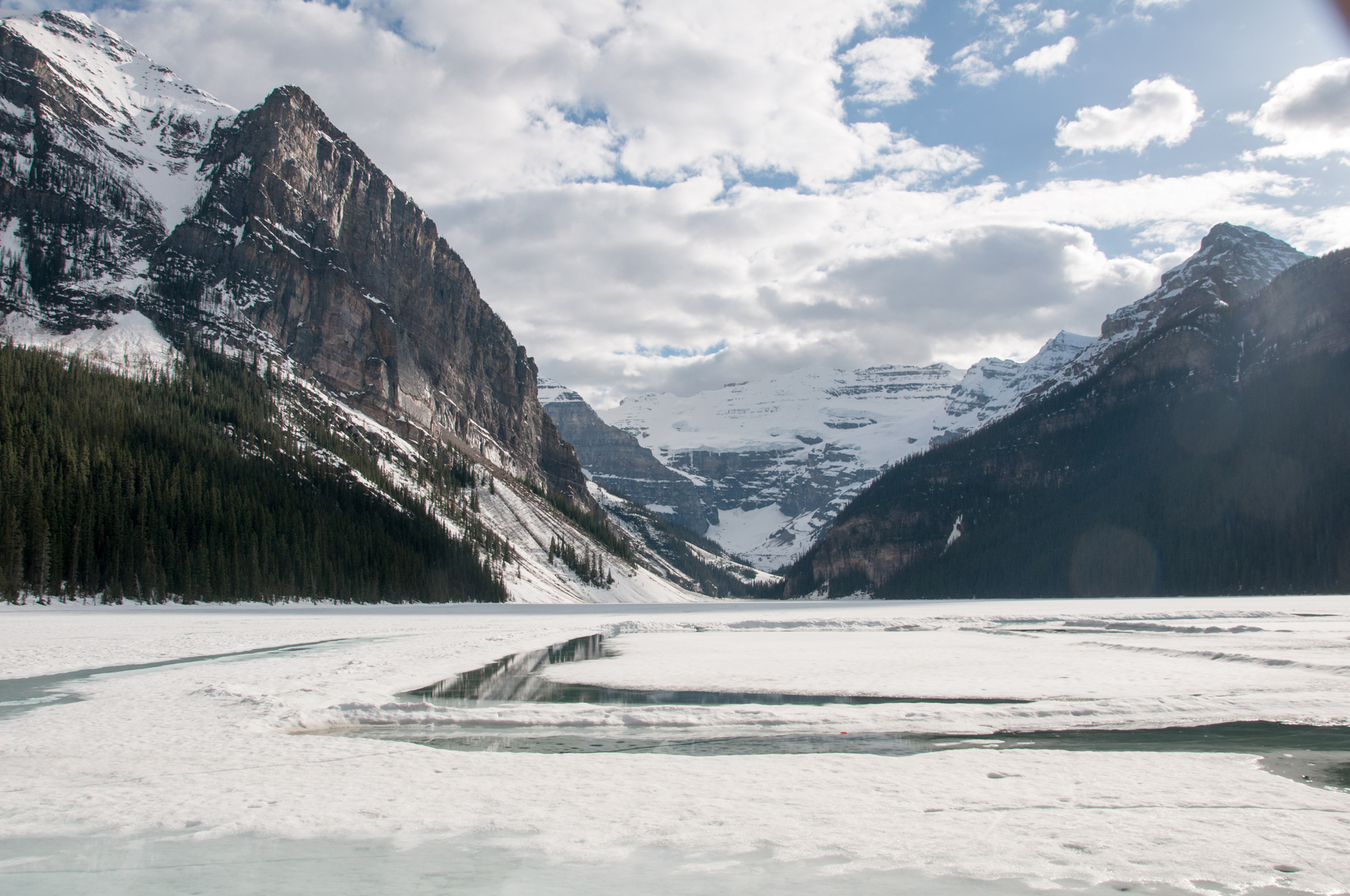 Fast eine Stunde müssen wir wieder zurück nach Lake Louise fahren, um dort noch zum gleichnamigen See zu fahren. Der Blick ist wie auf allen Bildern mit den steil abfallenden Bergen links und rechts und den Mount Victoria weit hinten einrahmend. Direkt am Parkplatz und Seeanfang findet sich auch das bekannte Fairmont Hotel. Auch hier ist wieder Drohne fliegen verboten und leider sind hier auch wirklich viele Touristen, besonders Asiaten unterwegs, sodass man es nicht einfach trotzdem machen kann. Wir versuchen uns linksherum bis hinter ein Bootshaus zu kommen. Leider liegt wirklich viel Schnee und ich breche bis zur Hüfte ein. Wir blasen das mit der Drohne ab und kümmern uns lieber um das Abendessen.