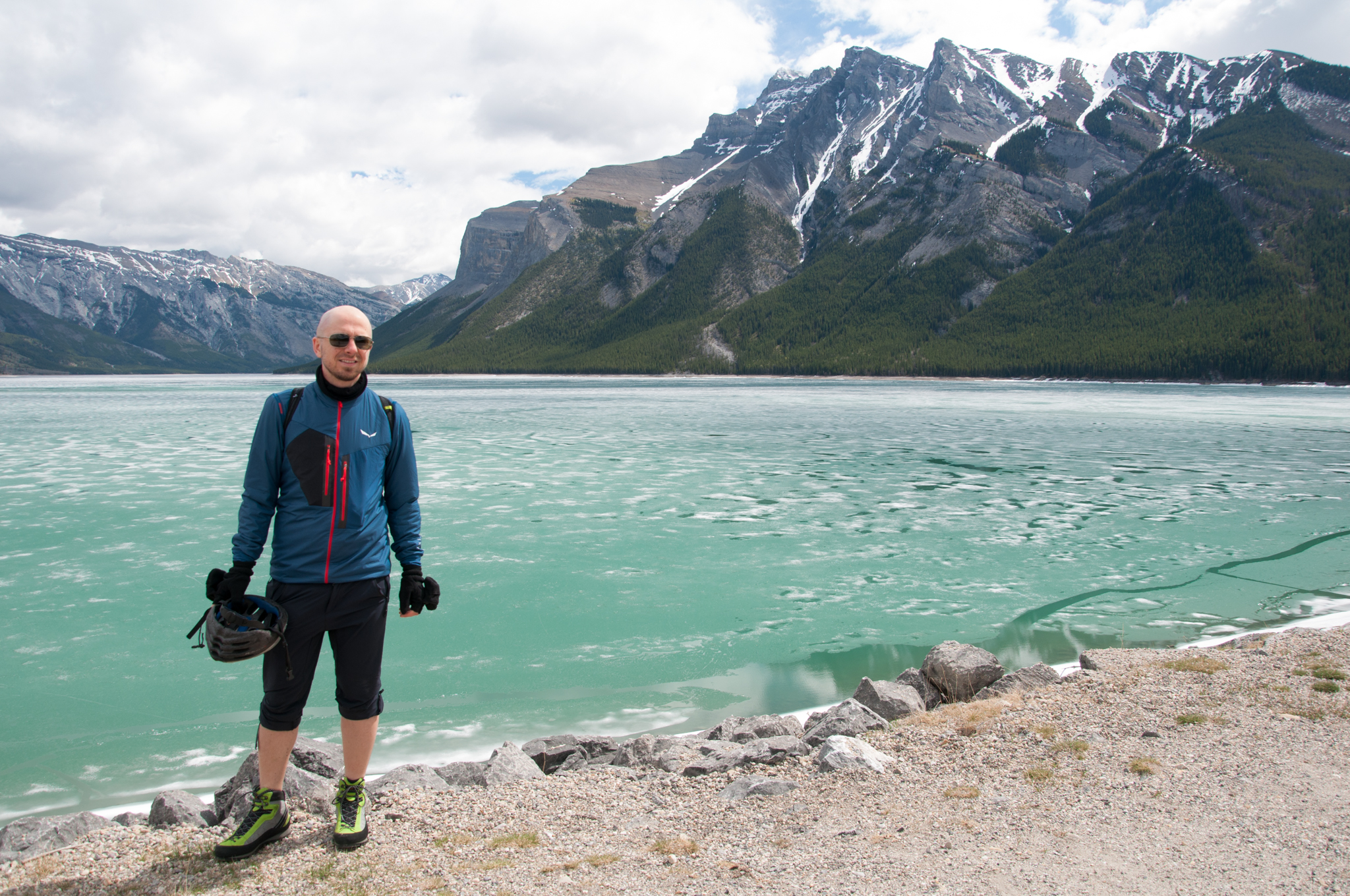 In Einheitsrädern von Größe XS für Julia bis XL für Chris incl. Kanadaflagge geht es dann los erstmal einen Fahrradweg aus Banff bis zum Highway raus, unter diesem drunter durch und dann die Straße über den Two Jack Lake zum Lake Minnewanka. Auf dem noch teilweise gefrorenen Two Jack Lake sehen wir 2 Stand Up Paddler. Der Bursche sogar oben ohne. Willkommen in Kanada!