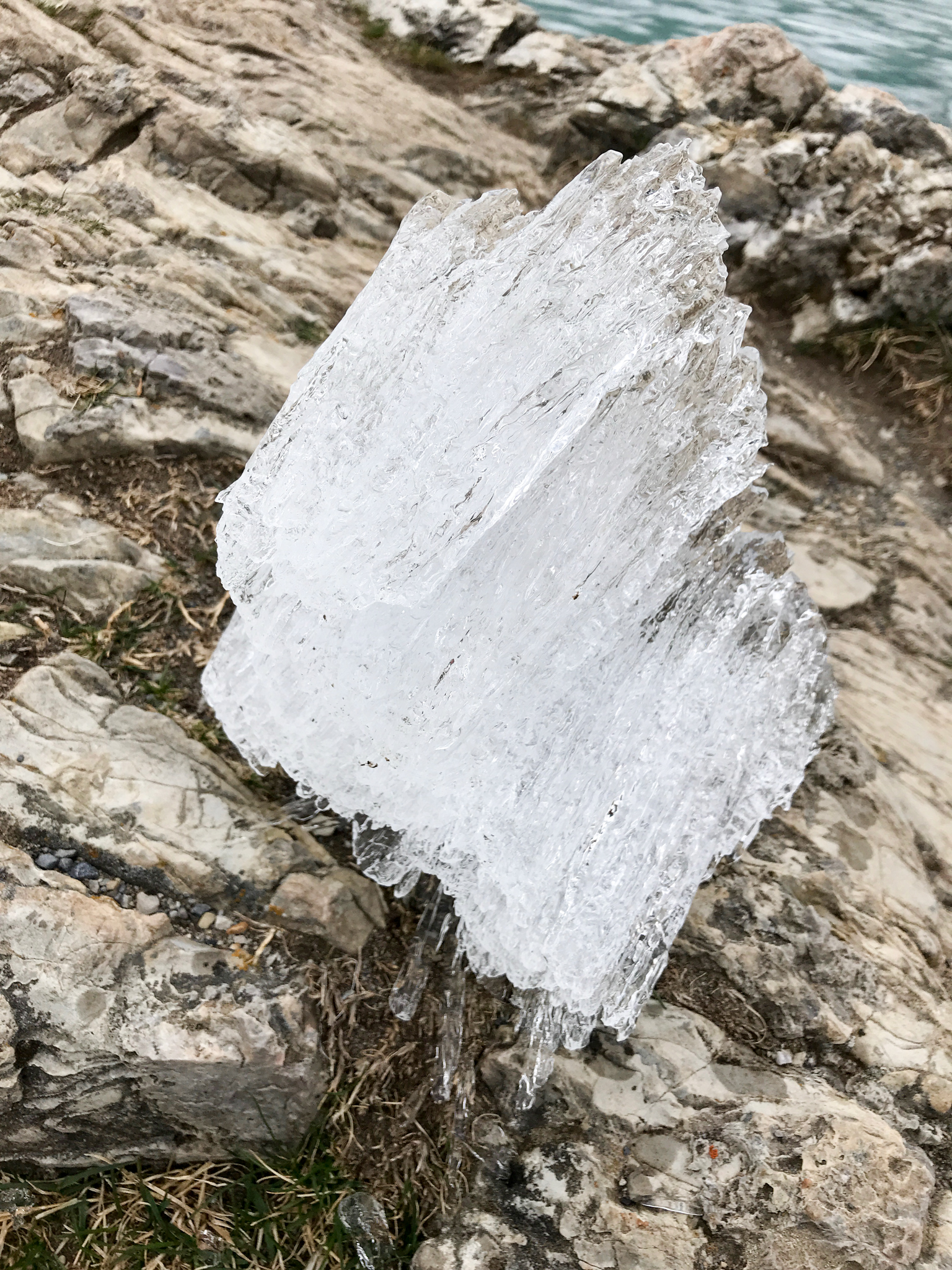 Nach der Fotopause bei Two Jack geht es dann nochmal ein bisschen zum Lake Minnewanka hoch, aber wirklich mit mehr als moderaten Steigungen. Auf dem Weg sehen wir eine Bergziehenherde neben der Straße. Lake Minnewanka selbst ist nochmal um einige Ecken atemberaubender als der erste See. Im Gegensatz zu Two Jack finden wir nicht nur ein paar Eisschollen sondern den kompletten See noch zugefroren. Von der eigentlichen Seefarbe sehen wir daher nix. Weiter die Straße runter finden wir sogar eine schwimmende Insel mit Häuschen drauf, die noch komplett eingefroren ist.