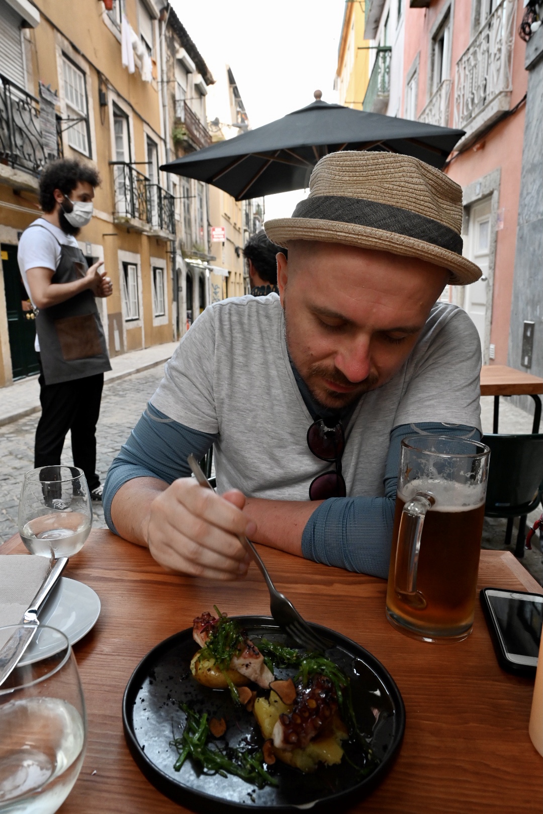 Kurz vorm Praça do Comércio setzen wir uns noch ein wenig in den Schatten, nachdem uns die Sonne schon gut erwischt hat. Zum Abendessen gehen wir heute ins Bairro Alto. Das Lokal, das wir über Tripadvisor gefunden haben, hat leider zu, aber unweit davon finden wir ein genauso gut bewertetes, portugiesisches Lokal und entscheiden uns für verschiedenen Fisch. Heute ist der letzte Tag mit 22 Uhr Sperrstunde und wir gehen danach wieder ins Hotel.