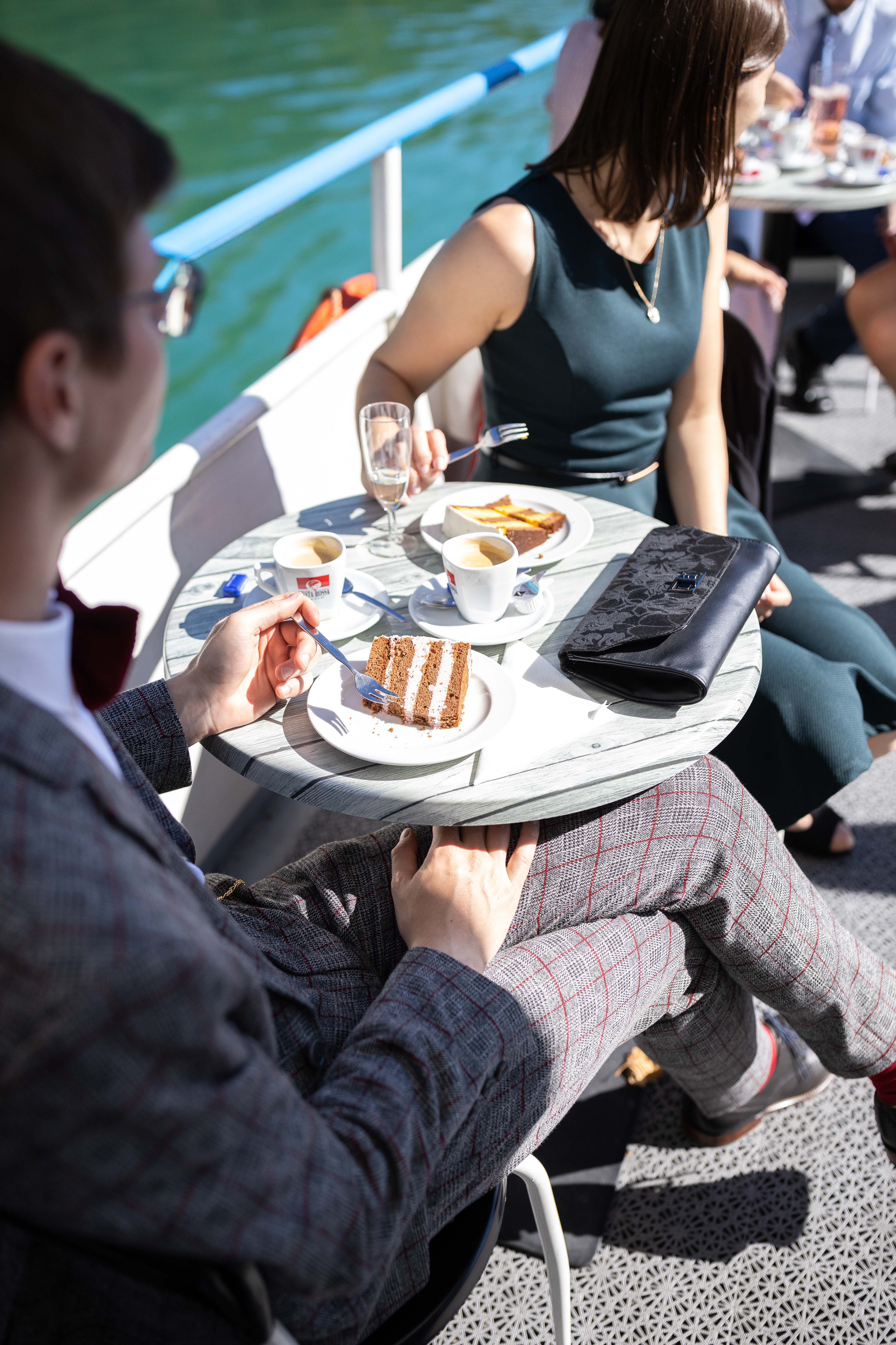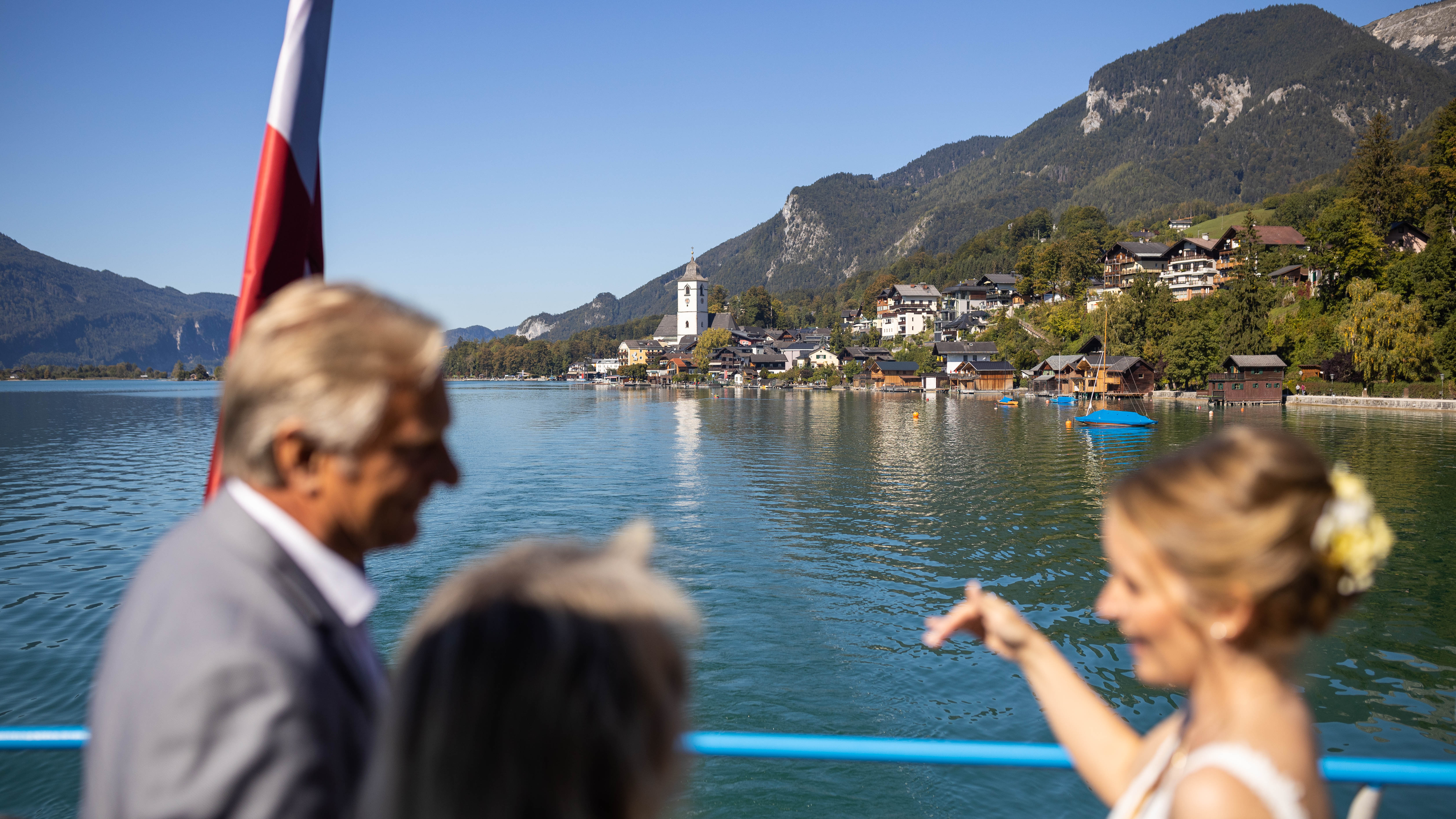 Um 12:15 Uhr legte das Hochzeitsschiff in St. Wolfgang Markt ab und fuhr mit uns einmal rund um den Wolfgangsee - erst Richtung Strobl, dann an der Falkensteinwand bis St. Gilgen. Um 13:00 Uhr wurde die Torte angeschnitten und nach etwa 2 Stunden waren wir wieder am Ausgangspunkt zurück. Bei Paul der Wirt spielte dann auch schon die Band "All Jazz Ambassadors" auf der Sonnenterrasse auf.