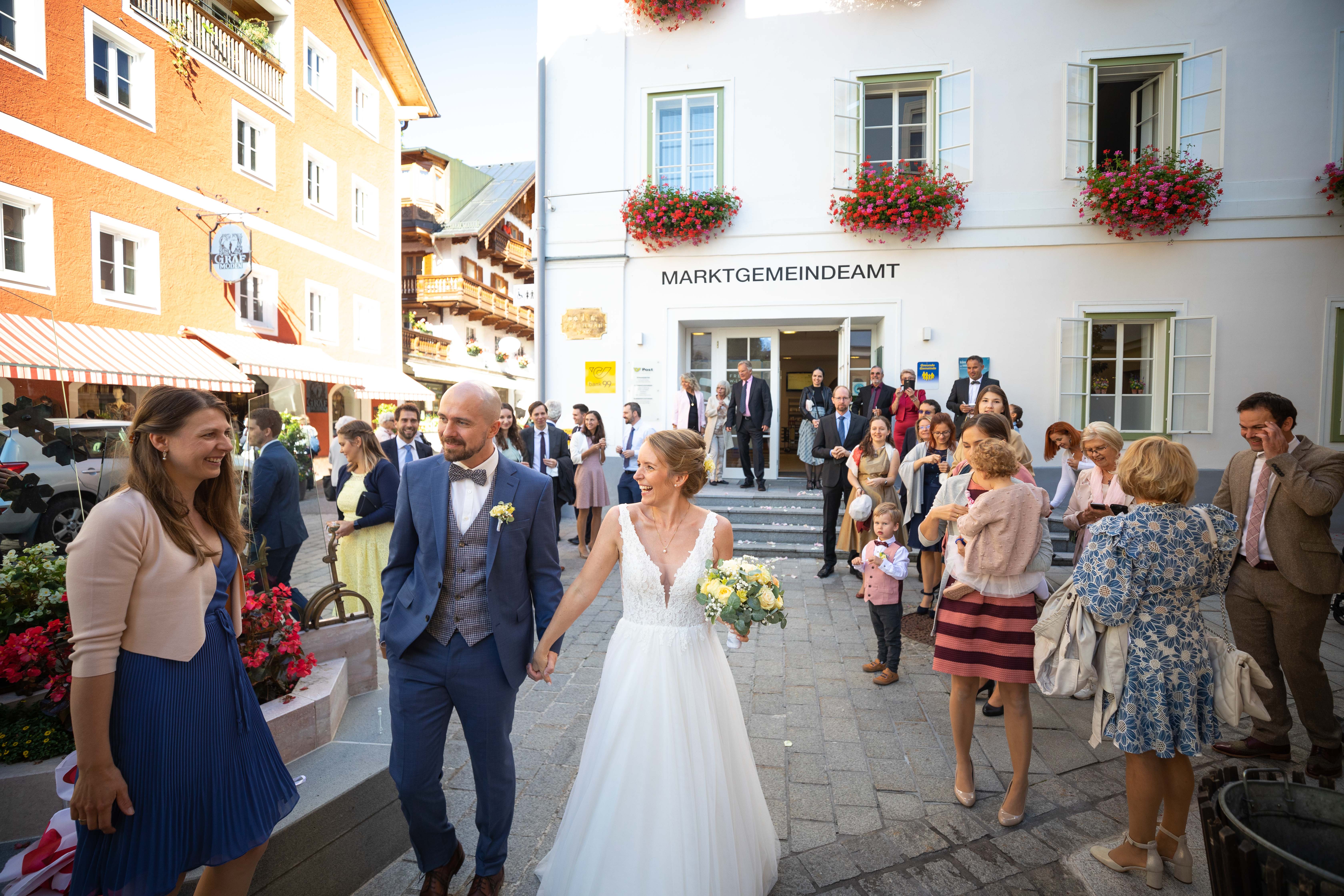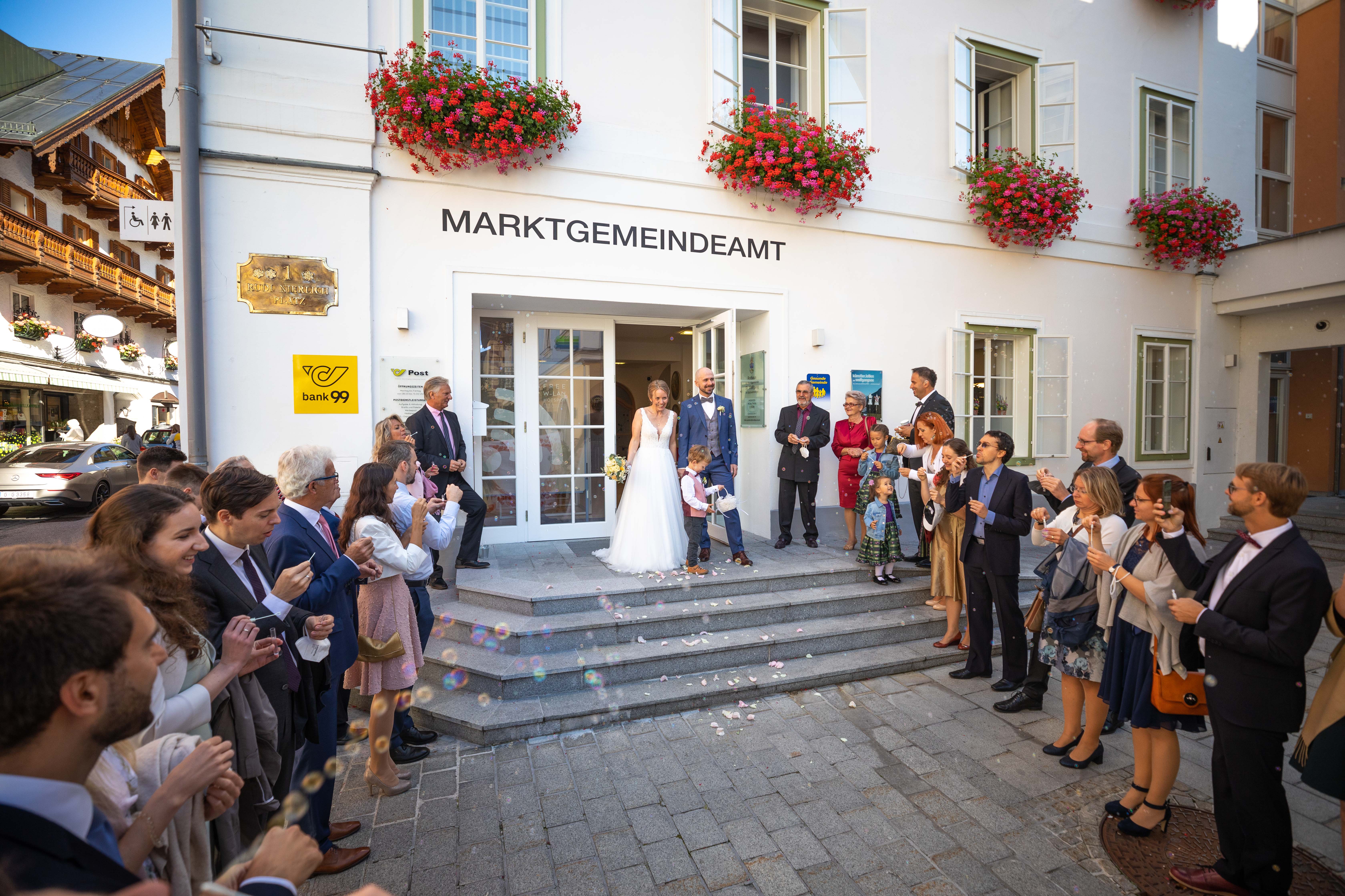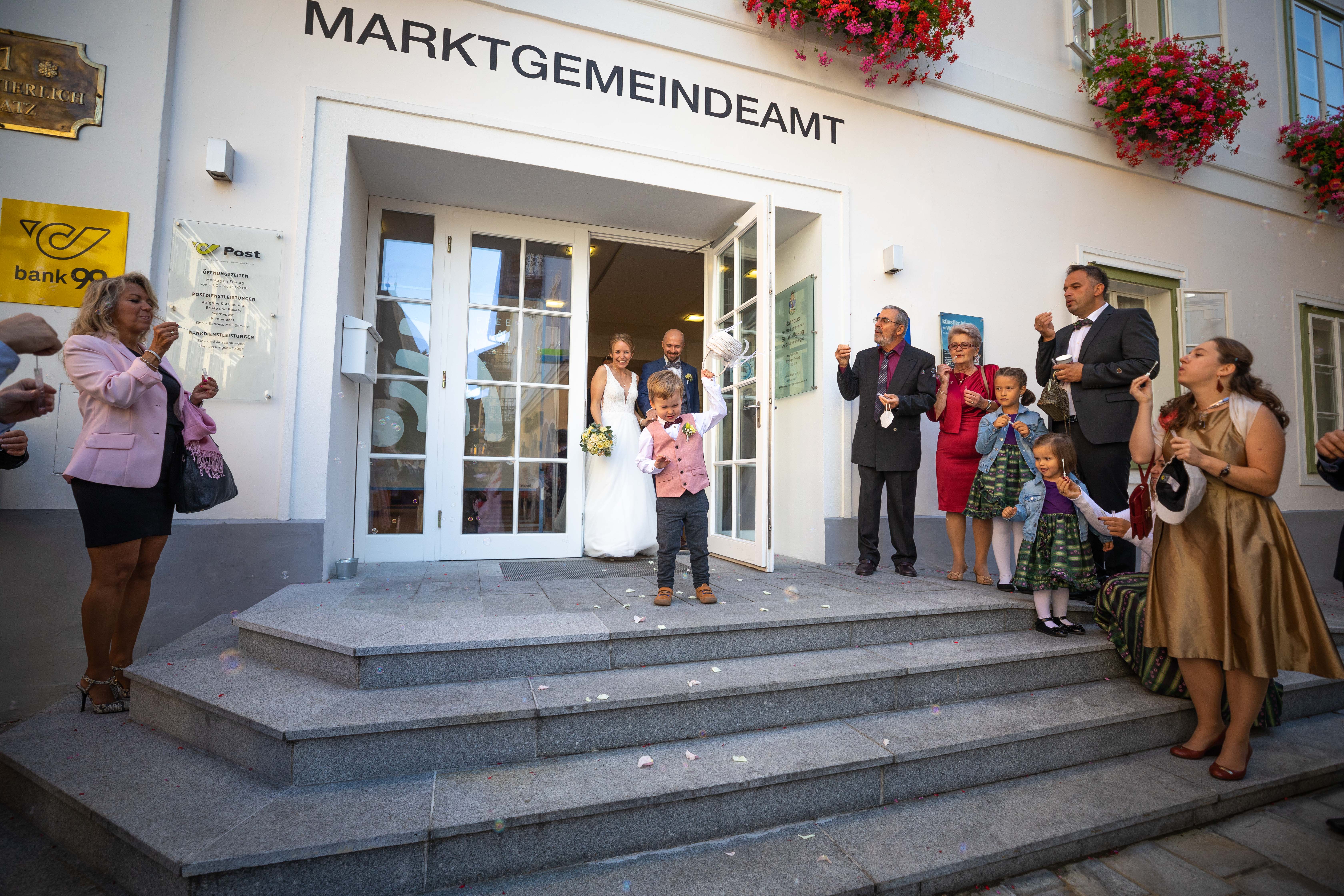 Um 9:30 Uhr wurden wir im Standesamt St. Wolfgang getraut. Die zwei Marias begleiteten die Trauung auf Klavier und Querflöte mit den Stücken "La vie en rose" und "Dream a litte dream of me". Leo kam als Ringträger und Blumenjunge ganz groß raus.