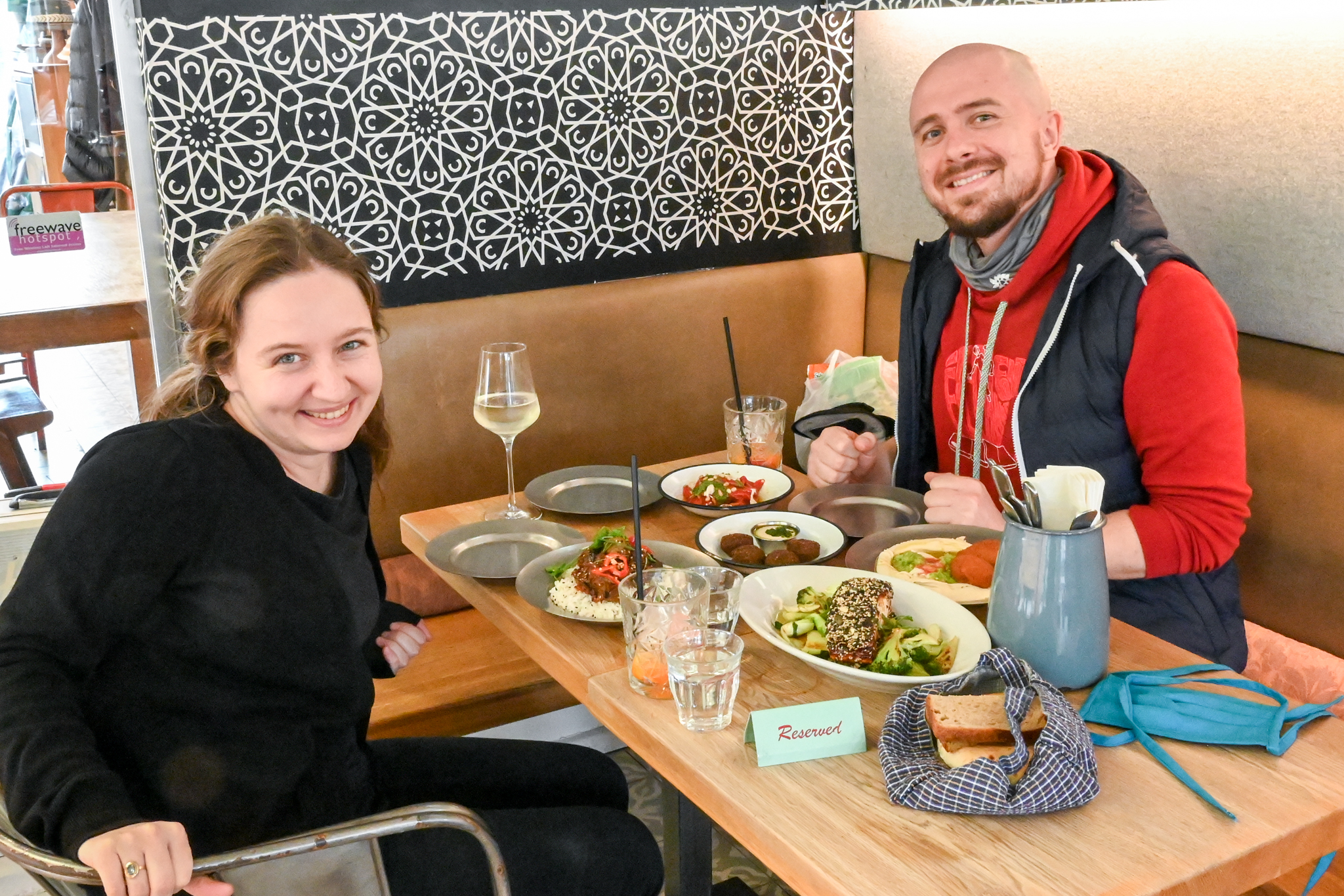 Viertel vor 6 sind wir am Naschmarkt. Die Lokale inkl. das Neni haben schon auf. Auch hier laufen alle Kellner mit Mund-Nasen-Schutz oder mit Plexiglasscheiben wie Schweißermasken herum. Wir entscheiden uns für einen Tisch im Innenraum, nachdem es ein kleiner Raum im Nebengebäude mit nur 5 Tischen ist und es wohl mit der Zeit kühler werden wird. Zuerst versuchen wir uns selbst an der Speisekarte, dann überlassen wir es aber doch dem (sehr engagierten) Kellner, uns eine Auswahl zusammenzustellen. Zu unseren Kumquat Gin Tonic und Weißem Spritzer bekommen wir Karam Melanzani, Kibbeh mit Hummus, Lachsfilet, Ofenpaprika, Falafel und Brot. Alles sehr gut, der Hummus für meinen Geschmack mit ein bisschen zuviel bitterer Sesampaste/Tahini. Auch bei den Cocktails merkt man die Betonung der Bitternoten.