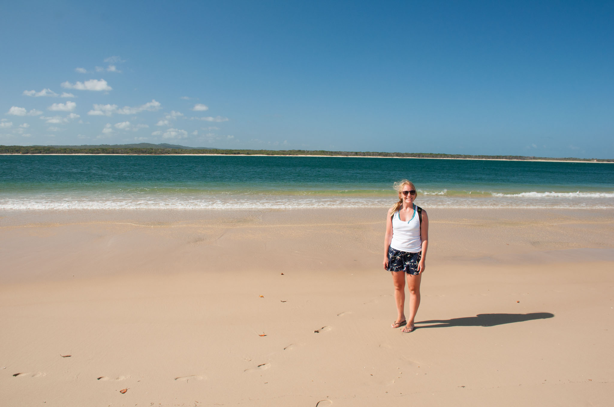 Heute haben wir circa 180km, 2 Stunden Fahrt vor uns bis Rainbow Beach, von dessen nördlichem Ende man in 1km Entfernung gut Fraser Island sieht. Bis dahin geht es durch einen sehr monotonen Wald – man könnte meinen, hier wäre vor einigen Jahren ein Buschfeuer zugange gewesen. Die Bäume sind akkurat in Reihen gepflanzt. Sie haben einen Touch von Nadelbaum, definitiv ist kein Eukalyptus dabei. Das letzte Stück des Weges ist eine sehr windige Straße, in die noch mit Vorsatz kleine, enge Kurven eingebaut hat, damit die Autos auch ja nicht schneller als 40km/h fahren können. Uns begegnen viele 4WDS, besonders Jeeps, die wohl von Fraser Island kommen.